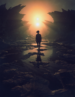 Back to Beeple portfolio I started looking for an image that could go as western setting and I came by this one. It fitted perfectly except there was no cowboy hat at the image, but it was so close to a western that I was able concot a solution